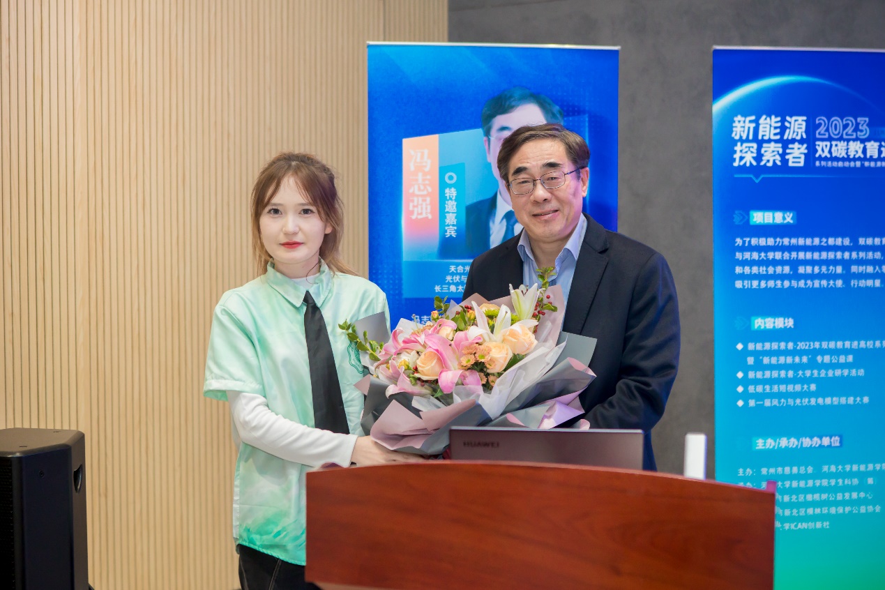 常州市新北区棵林环境保护协会副理事长吴钰涵为同学们系统地介绍了本次双碳教育进高校系列活动的总体安排和具体内容,并表示:双碳教育项目走进高校,将进一步落实推进双碳知识的普及,融入创新实践,有效整合高校、企业,以及各类社会资源,加强良性互动,形成助力双碳目标的人才梯队。