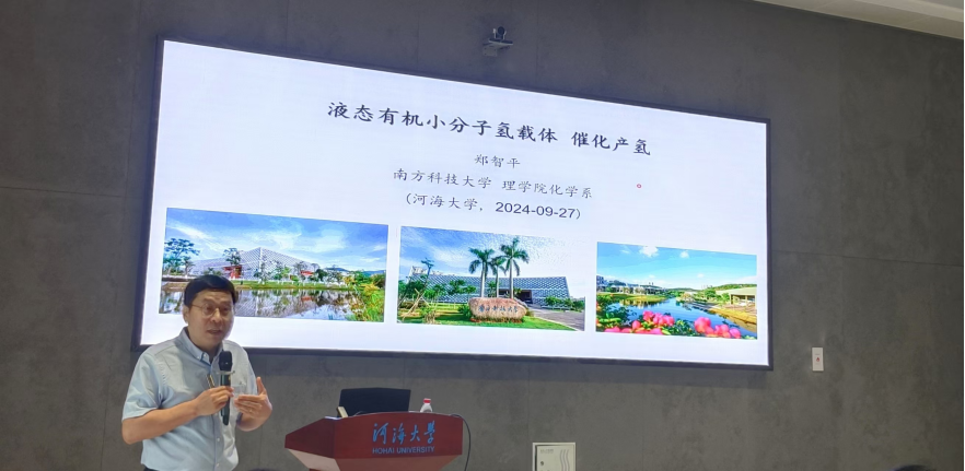 郑教授以“用氢不见氢-液态小分子氢载体的高效催化产氢”为题,为师生们分享了氢能源领域的最新研究成果。报告中,郑教授详细介绍了基于钌配合物的均相及非均相催化剂的设计合成过程,以及这些催化剂在催化产氢方面的优异表现。针对当前氢能源使用面临的高能耗、高成本及安全隐患等问题,郑教授提出了创新的解决方案,并展望了未来研究的方向,引发了与会师生的热烈讨论与思考。