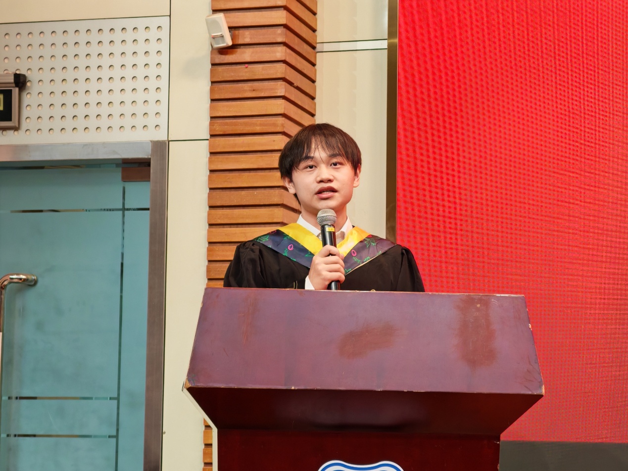 毕业生代表郭小庄同学,代表所有毕业生,分享了成长经历与感悟。他回顾了自己大学的成长历程,真挚表达了对公司公司培育之恩的深切感激,表达了对老师、同学的感恩之情,更以青春之名许下奋进誓言,号召同窗们永葆热忱之心,在人生新征程上突破自我,书写属于时代青年的精彩篇章。