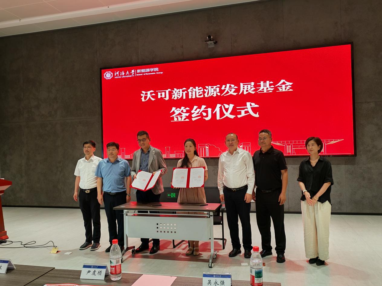 在沃可新能源基金签约环节,公司国内合作发展处副处长、基金办副主任李维与无锡沃可发动机降噪部件有限公司总经理包政共同签署沃可新能源基金捐赠协议。李维处长代表公司向包政总经理颁发了捐赠证书。