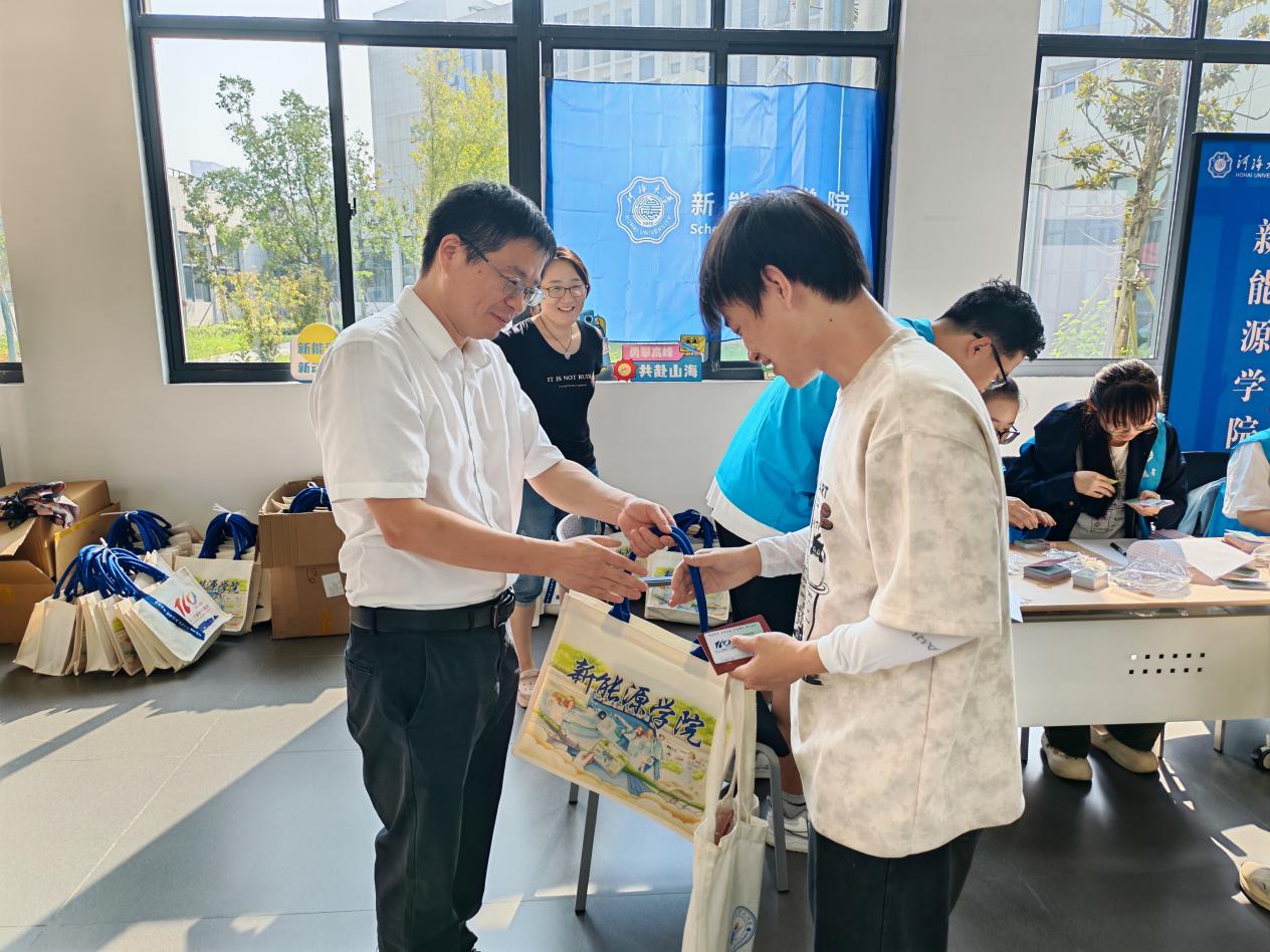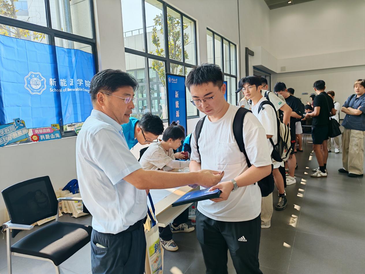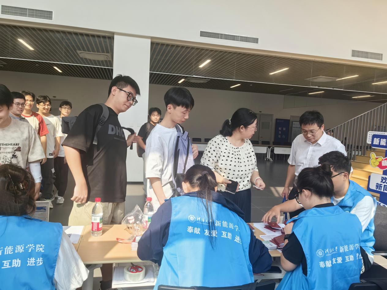 公司党委书记杨桂山亲临迎新现场,详细了解公司迎新工作进展,并与工作人员和新生亲切交流。杨书记勉励同学们要把握好新能源发展的时代机遇,勇于交叉创新,练就过硬本领,把论文写在祖国大地上,在绿色征程中书写青春答卷。